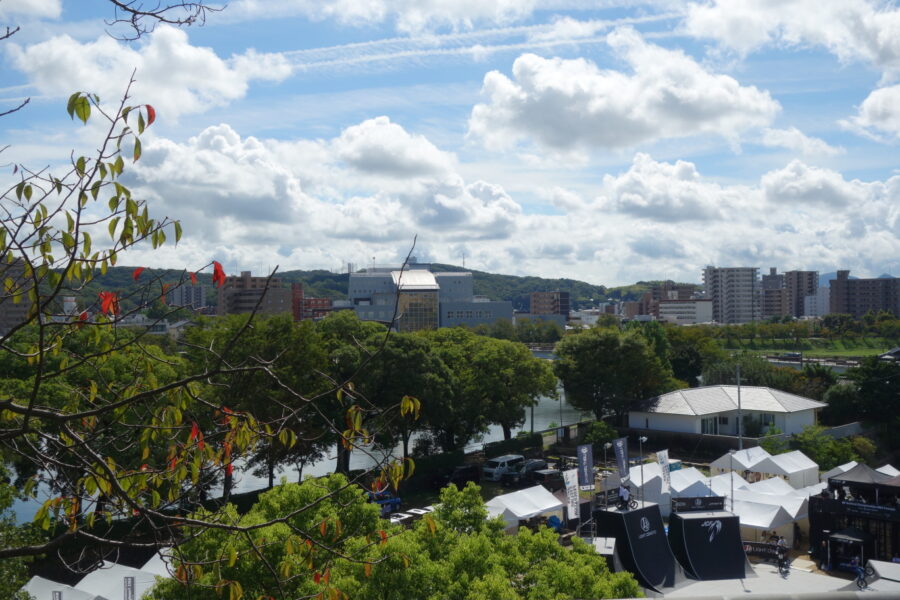 高所から望む岡山市内。 足元ではBMXフリースタイルの大会をやっていました。  快晴の天気、暑くて熱くて天守に入るのは遠慮しました。 また涼しい頃に…。 次の場所に向かいます。