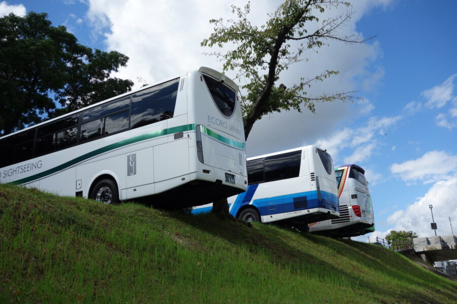 広い駐車場、観光バスがなかなか攻めた駐車をしていました。