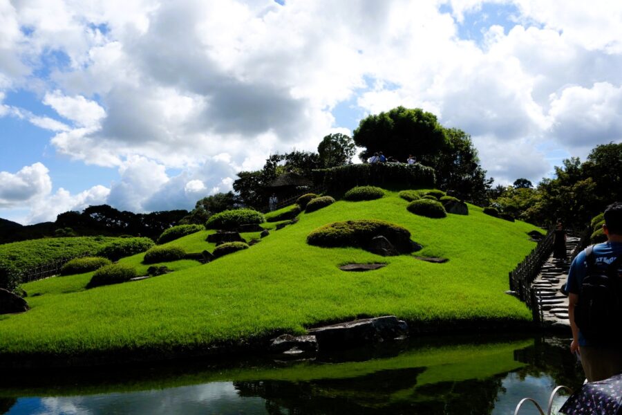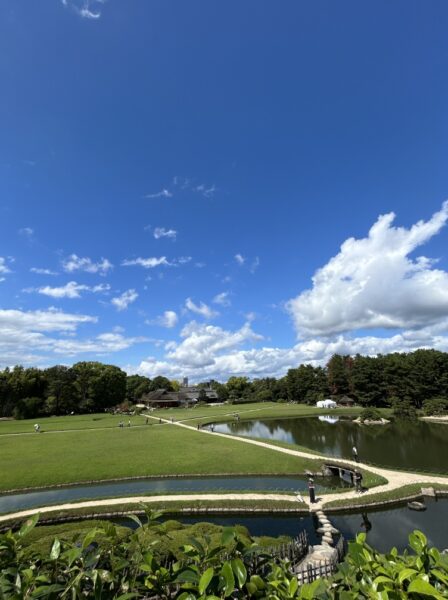 素晴らしく美しい庭園を堪能しました。 この日は日曜日でお客様もいっぱい。 5割くらいは外国の方だったでしょうか。 それにしても、暑い。 出発時には雨模様だったので帽子を持ってきていません。 おハゲの頭には日光がダイレクトに容赦なく…。 雨傘を指してみましたが、重くて結局持って歩くことに…。