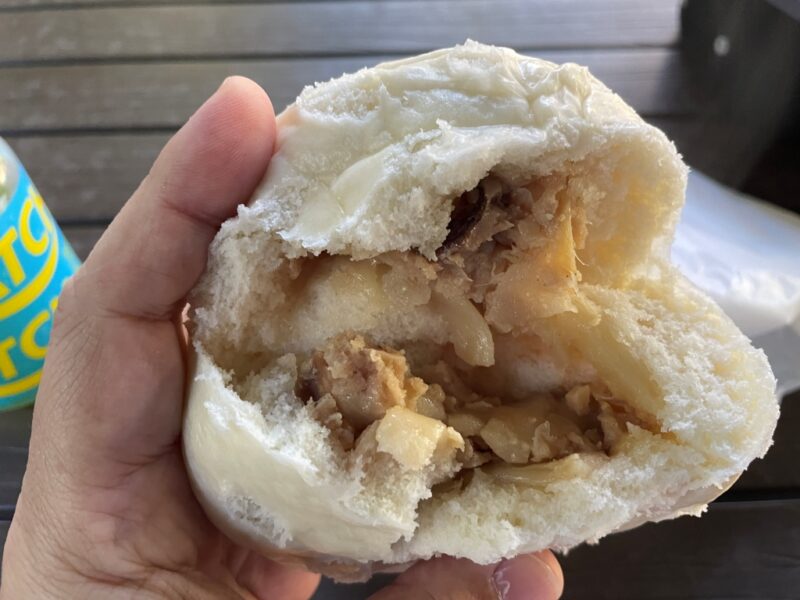 ちょっと大きめの豚まんは食べ応えありです。 いつもの豚まんの餡の中にほどよくカットされたきしめんが隠れています。 よく気をつけないとわからないですね。