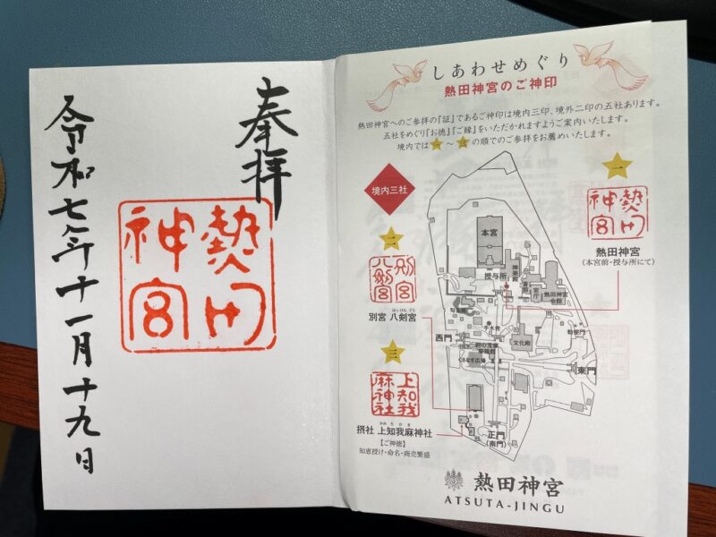 割とあっさりしておりますね。 しかし熱田神宮の御朱印の授与所、平日でも並んでました。 いただくのに15分ほど並んだと思います。 一人ひとり、眼の前で書いていただけるのでありがたいといえばありがたいのですが。 ちょっと非効率かなぁ。 今まで御朱印いただいたところでは、鹿島神宮がいちばんハイテクでした。 とはいえ私はしょっちゅう旅行に御朱印帳を持っていくのを忘れるので、参拝をしたけど御朱印をいただいてないところでもっとハイテクなところがあったかもしれません。